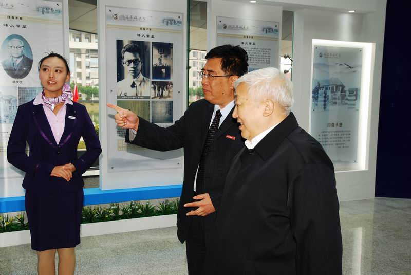 校党委书记郑祖宪陪同原教育部副部长周远清观看75周年图片展